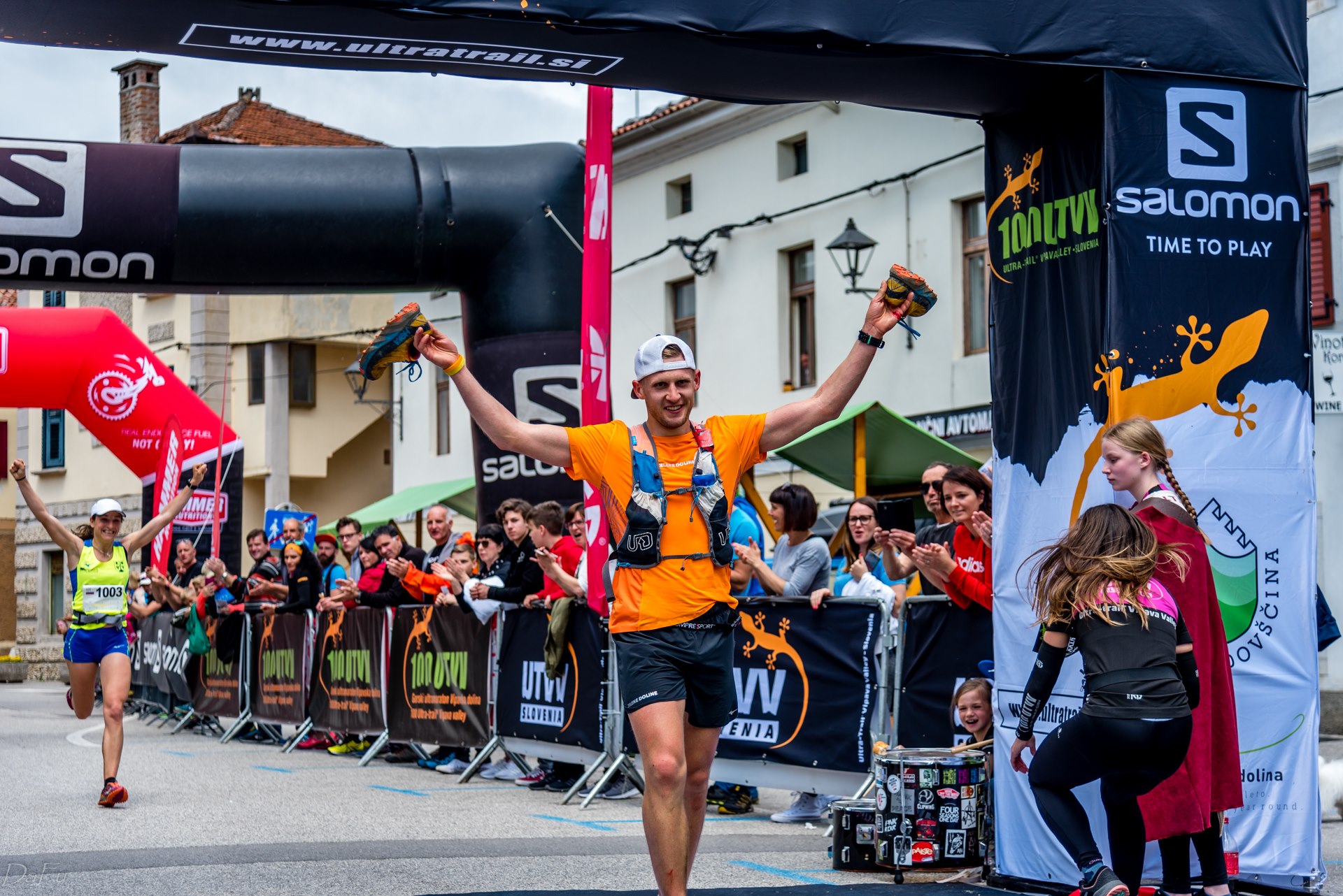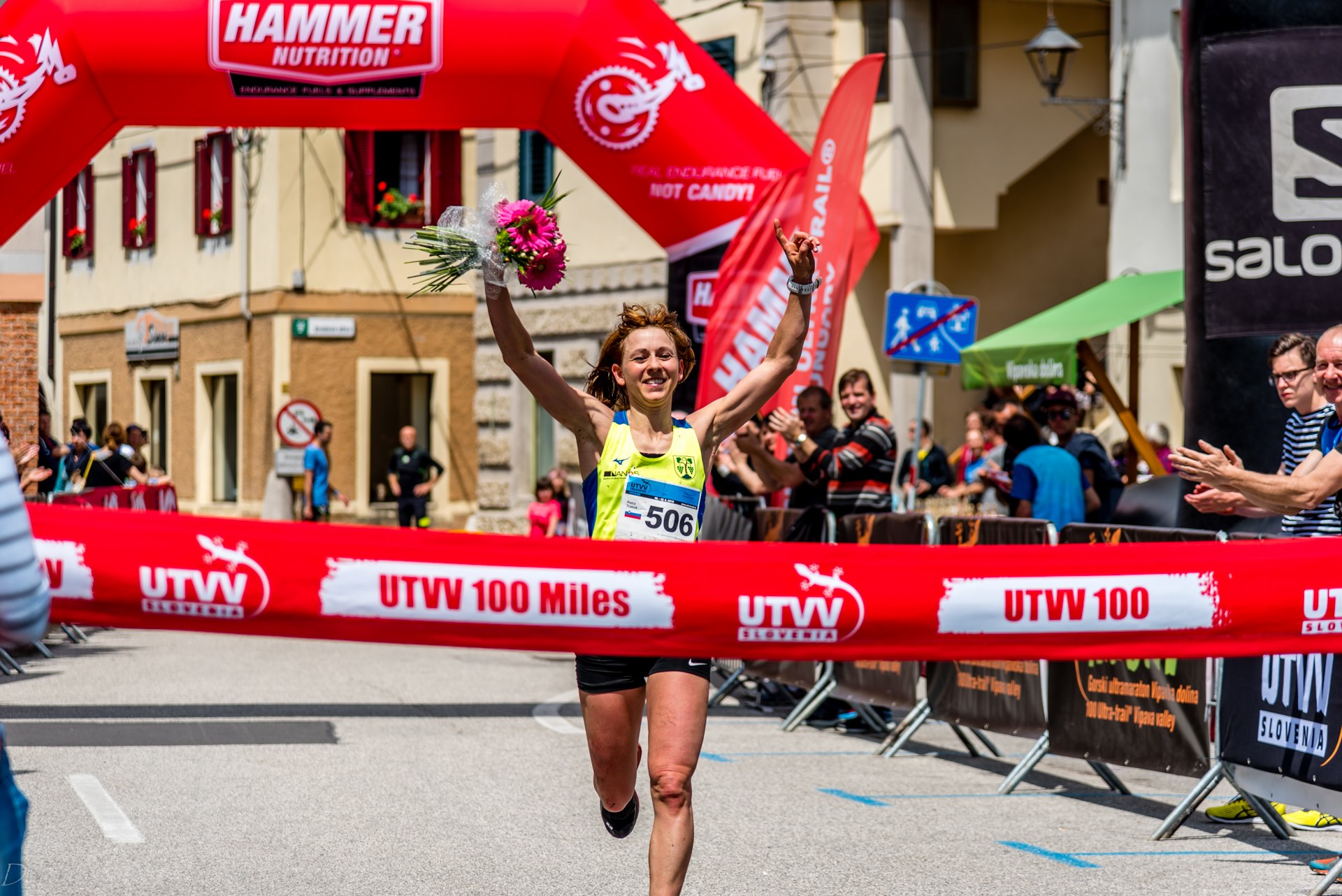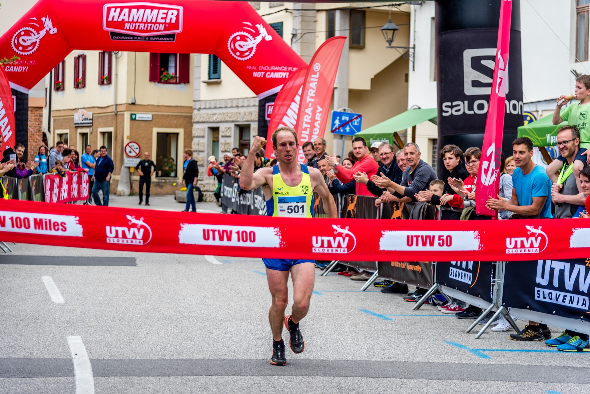 There it is, the castle, the rocks… I recognise the final. Two more sharp turns and I’ll be on the concrete in the village of Vipava. I can hear the rocks rolling, Petra finishes strong less than a minute behind. As I reach the steep streets, I can increase the length of my strides, a kid sprints down the hill with me until the last left turn…I can hear the noise of the finish line. I see the Salomon and Hammer nutrition inflatable arches…I raise my right hand and fly through the line screaming of joy, pain, satisfaction and rage. I came back, I finish 3rd overall beating the 5 hour mark by 9 seconds.