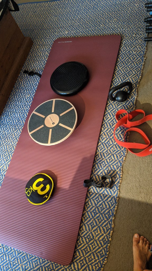 - Stand on Swiss ball (move side to side / up and down / forward and backward / pass a weighted ball around my waist, between my legs and overhead – ideally find someone to throw the ball back)